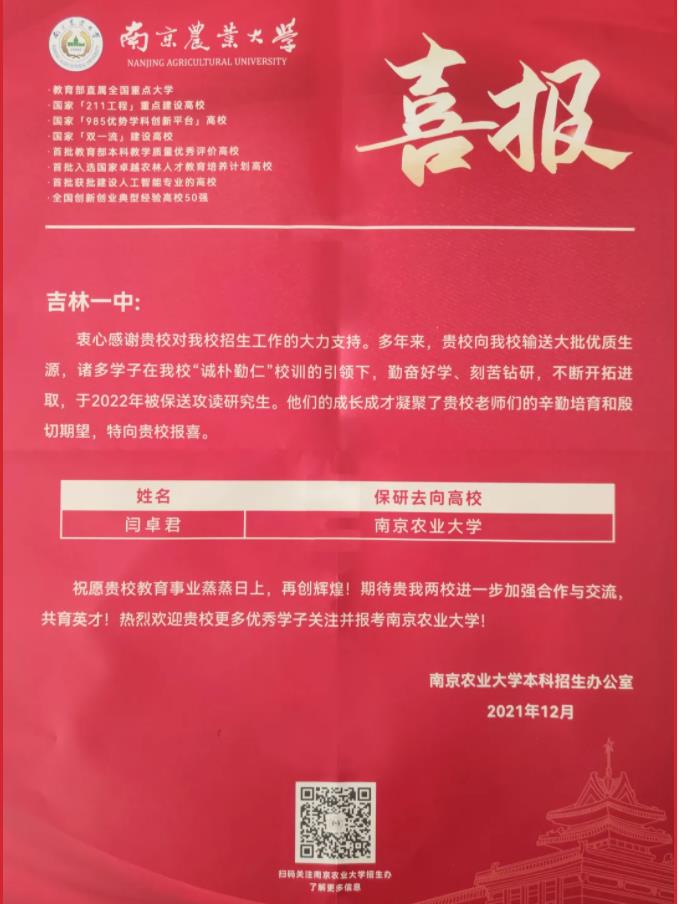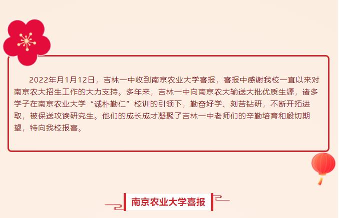 南京农业大学向吉林一中发来喜报