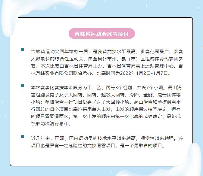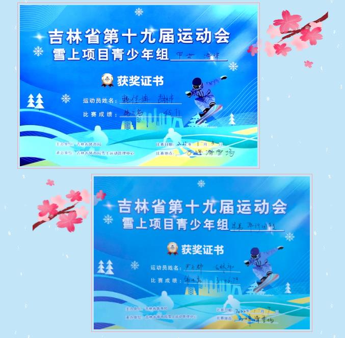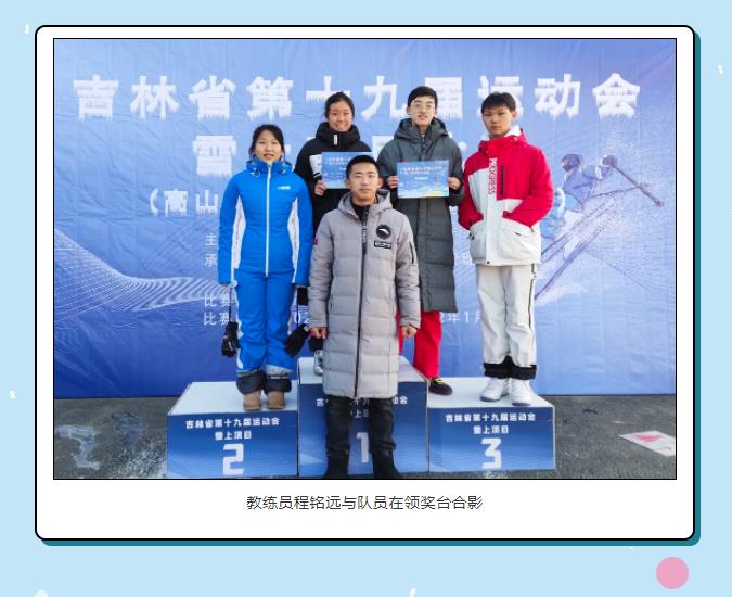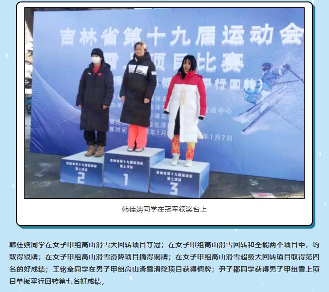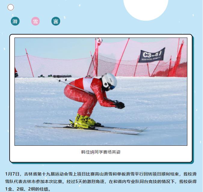 1月7日,吉林省第十九届运动会雪上项目比赛高山滑雪和单板滑雪平行回转项目顺利结束,我校滑雪队代表吉林市参加本次比赛。经过5天的激烈角逐,在和省内专业队同台竞技的情况下,我校获得1金、2银、2铜的佳绩。