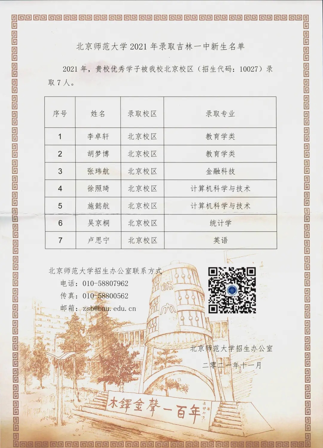 北京师范大学向吉林一中发来喜报