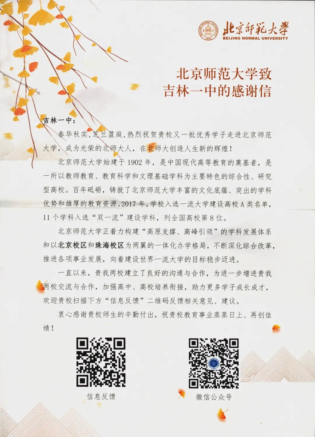 一直以来,两校建立了良好的沟通与合作,为进一步增进两校交流与合作,加强高中、高校培养衔接,助力更多学子成长成才,北师大欢迎吉林一中扫描下方“信息反馈”二维码反馈相关意见、建议。